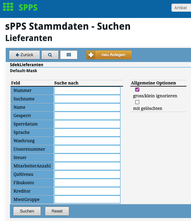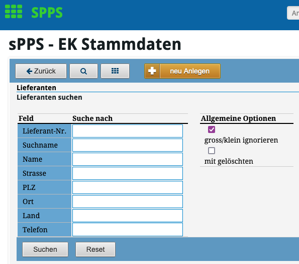 Suchergebnis über die Suchmaske über Stammdaten -> EK-Stammdaten: