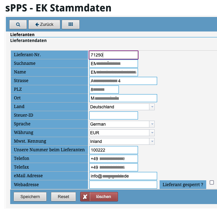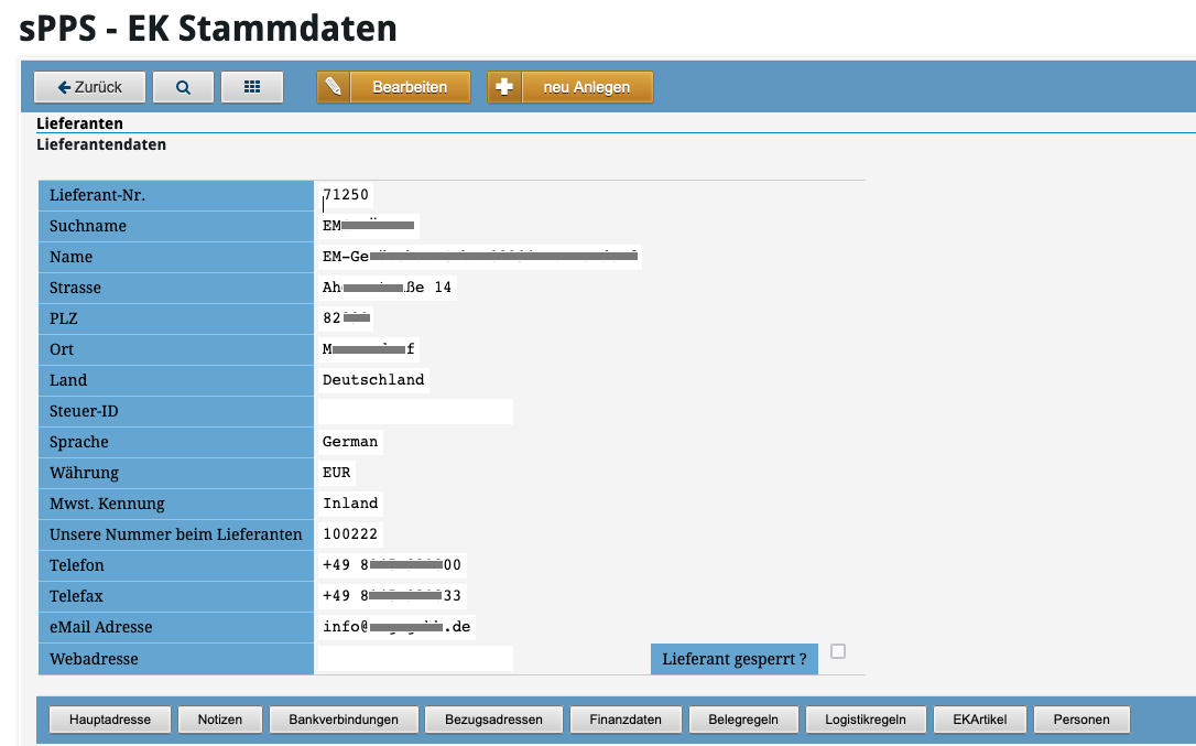 Es werden die Daten des Lieferanten angezeigt. Unterhalb der Daten ist eine Reihe mit